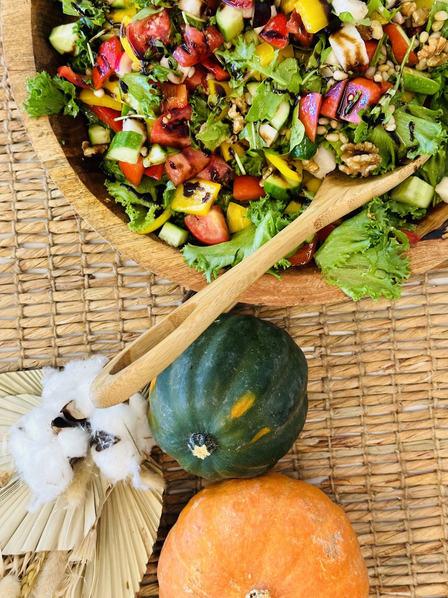 סלט שוק טבעוני מכיל מגוון רחב של ירקות, ירוקים, חמוציות ואגוזי מלך